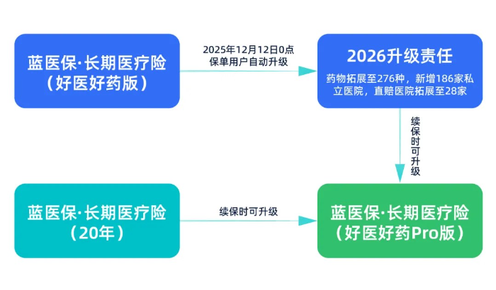 藍醫保·長期醫療險(20年)和藍醫保·長期醫療險(好醫好藥版)2款產品,滿足條件的保單用戶都可在續保時升級到藍醫保·長期醫療險(好醫好藥Pro版)