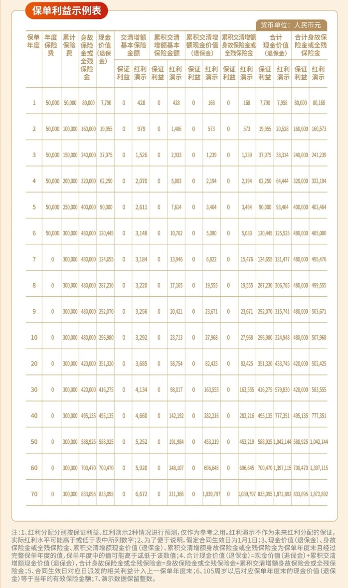 注:1.合同生效或最后一次復(fù)效(以較遲者為準(zhǔn))之日起90日內(nèi)保單利益將有所不同。2.被保險人身故或確定全殘時的到達年齡所對應(yīng)的比例為:40周歲及以下160%,41-60周歲140%,61周歲及以上120%。